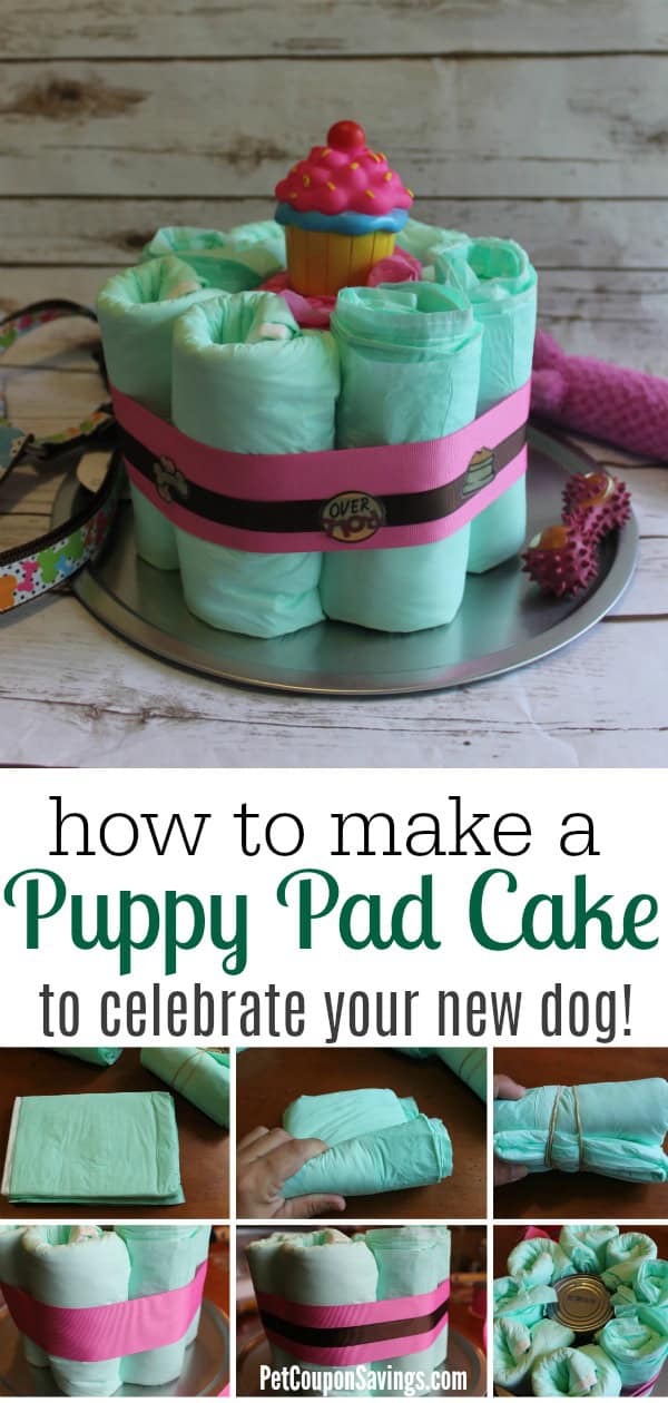 One of my favorite baby shower decorations is the popular diaper cake. So I figured why not make a Puppy Pad Cake? A cute and useful centerpiece for our little puppy shower. I used piddle pads, dog toys and treats. Collars, leashes, outfits, doggy barrettes, etc. also make great decorations and filler for your cake.